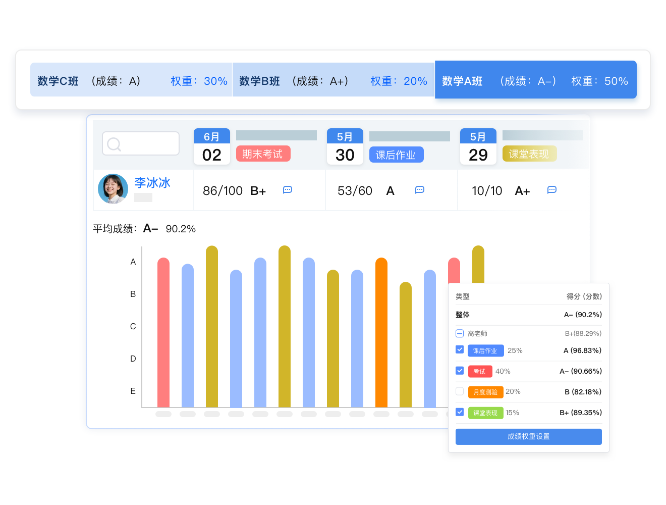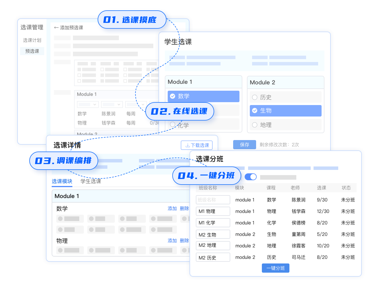 提供选排课、在线作业、分层教学、个性化学习、分析报告等学生成长服务
